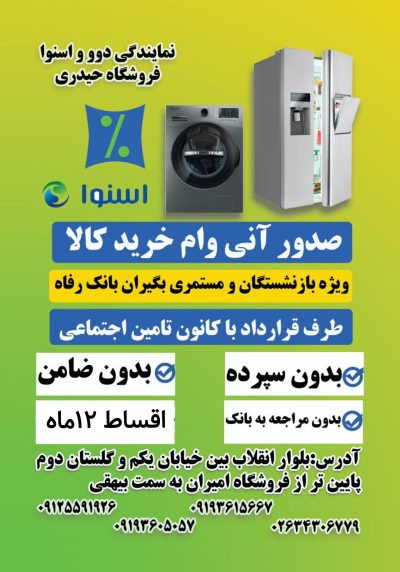 بدون ضامن بدون پیش پرداخت بدون سپرده گذاری وام انی را دریافت کنید وشما حقوق بگیران عزیز بانک رفاه وتحویل کالا به روز میباشدتمامی محصولات اسنوا ودوورا اقساطی خرید کنیدبازنشستگان وحقوق بگیران سراسر کشور به صورت حضوری وغیر حصوری بدون مراجعه به شعب بانکی بدون نیاز به کسر از حقوق خریدی اسان را از فروشگاه لوازم خانکی زنجیره ای اسنوا ودوو حیدری تجربه کنید