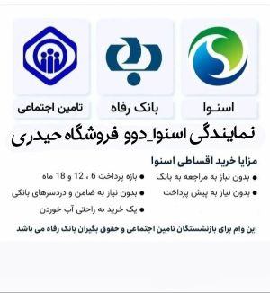 بدون ضامن بدون پیش پرداخت بدون سپرده گذاری وام انی را دریافت کنید وشما حقوق بگیران عزیز بانک رفاه وتحویل کالا به روز میباشدتمامی محصولات اسنوا ودوورا اقساطی خرید کنیدبازنشستگان وحقوق بگیران سراسر کشور به صورت حضوری وغیر حصوری بدون مراجعه به شعب بانکی بدون نیاز به کسر از حقوق خریدی اسان را از فروشگاه لوازم خانکی زنجیره ای اسنوا ودوو حیدری تجربه کنید