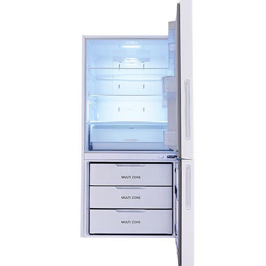 برای داشتن مواد غذایی تازه، تنها قدرت سرمایش کافی نیست، بلکه توزیع یکنواخت دما و رطوبت کنترلشده نقش مهمی دارند. در این مدل، سیستم Smart Cooling با استفاده از شش حسگر هوشمند دما، وضعیت داخلی یخچال و فریزر را بهطور لحظهای بررسی کرده و دمای مطلوب را حفظ میکند. فناوری گردش هوای چندگانه نیز باعث میشود هوای سرد بهصورت یکنواخت در تمام بخشهای یخچال پخش شود، در نتیجه هیچ نقطهای بیش از حد سرد یا گرم نمیشود. این ویژگی بهخصوص برای نگهداری میوه، سبزیجات و لبنیات بسیار مهم است، زیرا مانع از خراب شدن زودهنگام مواد غذایی میشود.